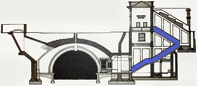 The above picture is the most common acknowledged representation of the original Baker St station (as depicted in the Wonderpass). This design of staircase was not used, also they are in a different location to the ones actually built. The natural light shafts depicted are in the roof of the tunnel and not at the sides as seen today.