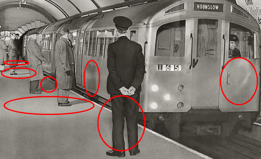 Shadows are also another indicator of the use of studio lights. The first passenger along the platform has his shadow projected so strongly onto the train itself its hard to see how the source could be from one of the fluorescent lights on the station tunnel’s ceiling.