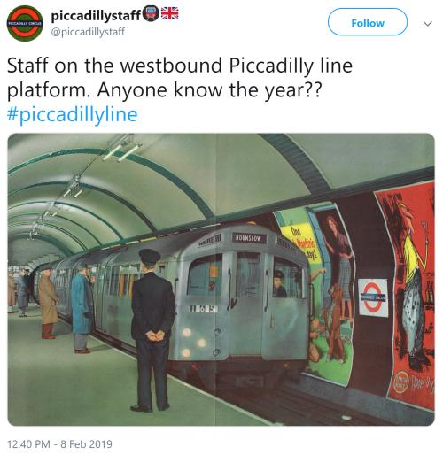 A special post about the 1956 tube stock. Piccadilly Circus station staff sent a tweet (one of their earliest ones) in February of this year asking for information on a picture of a train at the station itself. Its a photograph I have seen before – but not in colour and certainly not at such a scale. Its a lovely photograph but obviously not one taken off the cuff. Also the year it was taken is interesting. Nevertheless no-one replied to the station thus I thought I’d see if I could! And do a post about it too lol!
