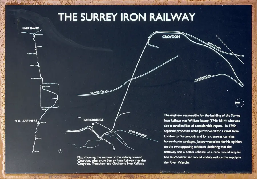 The first two examples are not too bad despite some errors. The last three boards, the route depicted is certainly right off the mark! Whoever designed these boards had somehow seen that the whole Surrey Iron Railway had gone via Hackbridge, somewhat following the River Wandle in part. The fact is the Surrey Iron Railway never took this route. It did have a branch from Mitcham to Hackbridge, however the main route went straight from Mitcham to Croydon via what now constitutes in large the Croydon tramlink route.