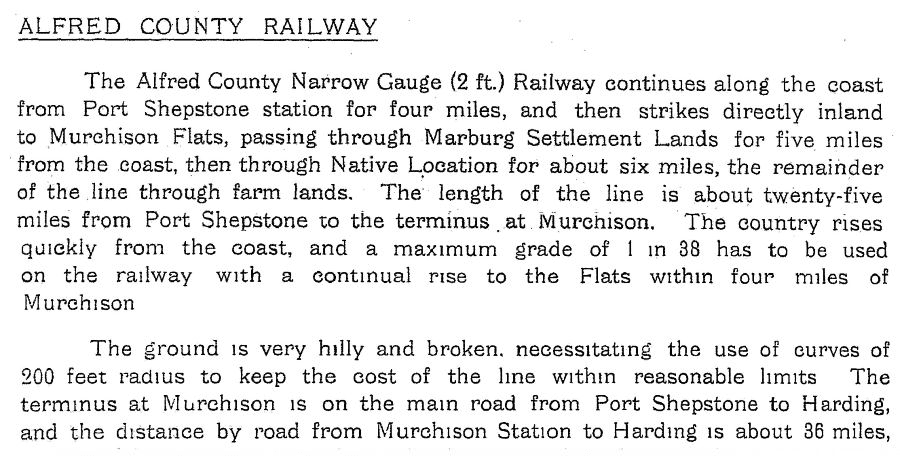 The Alfred County Railway (ACR) from the Natal Descriptive Guide 1911. Murchison didn’t get a station the nearest was at Bomela. Evidently the above was written before the route of the line was changed to run further south. Internet Archive.