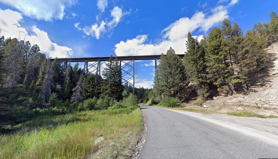 Blacktail Creek Trestle just northwest of the Pipestone tunnel. The crossing is one of the highest on the eastern half of the Rockies division. Source: Google Streets