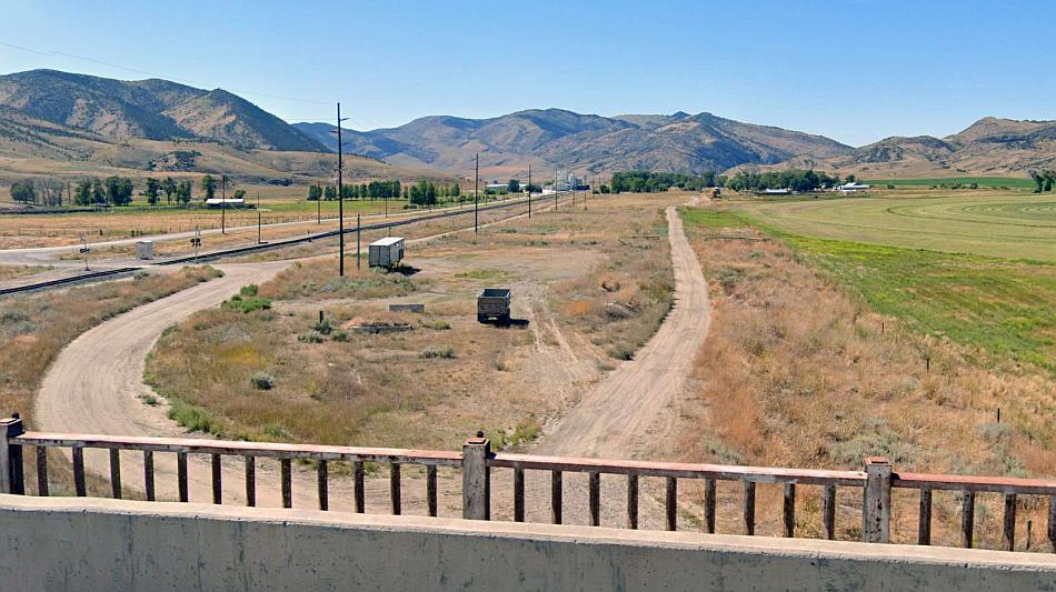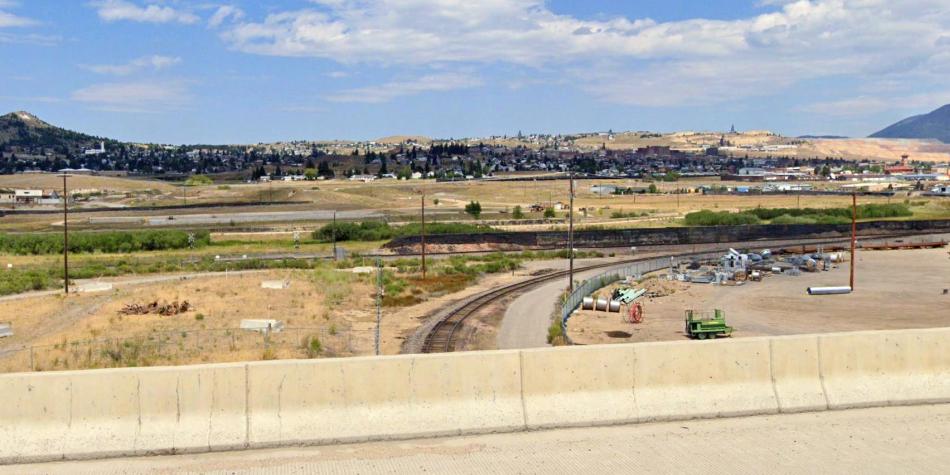 Looking from the highway to the south of the Silver Bow Creek. The Milwaukee line headed straight across the creek on a trestle then split into two – one towards Butte station (whose building and clock tower can be seen at far right.) The railway that can be seen is the Union Pacific’s track. Google Streets.