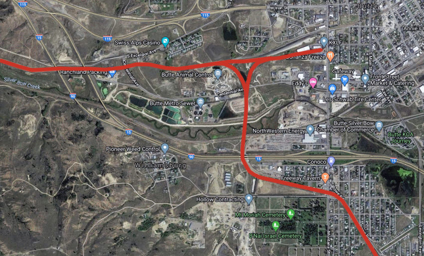 Centennial Avenue bridge in Butte. The Milwaukee crossed the road here.I think its about where the Milwaukee’s lines split with one line going towards Butte station and a pair towards Deer Lodge. Google Streets.