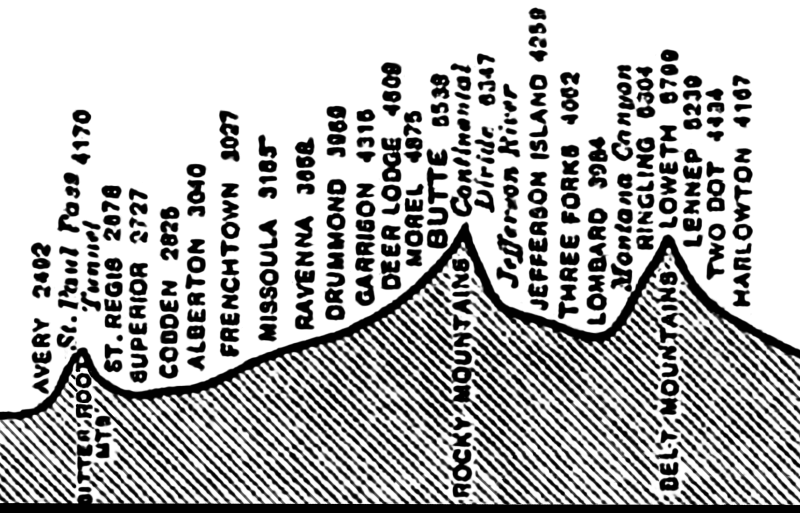 1 Harlowton 2 Martinsdale 3 Loweth 4 Ringling 5 Sixteen Mile Creek 6 Lombard 7 Trident 8 Three Forks 9 Sappington 10 Jefferson River 11 Pipestone Pass 12 Butte 13 Deer Lodge 14 Gold Creek 15 Drummond 16 Clinton 17 Missoula 18 Alberton 19 Superior 20 St Regis 21 Haugan 22 Avery