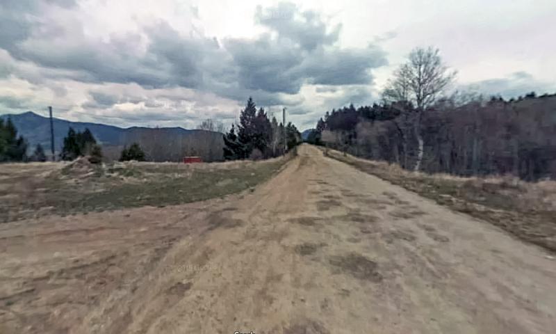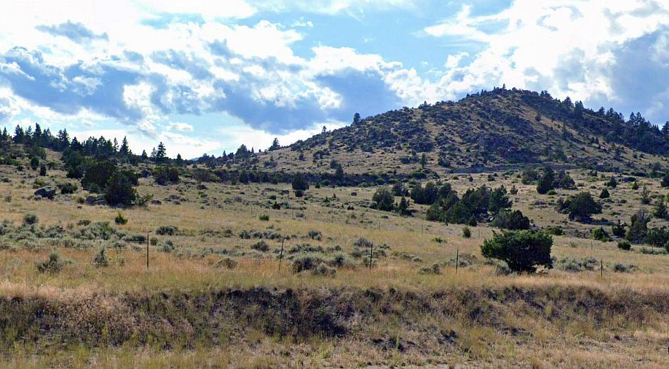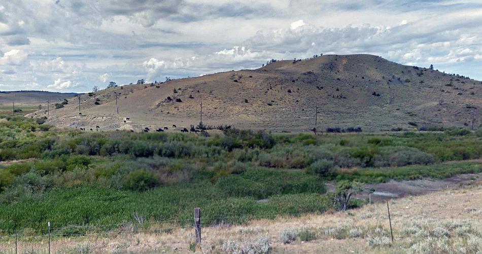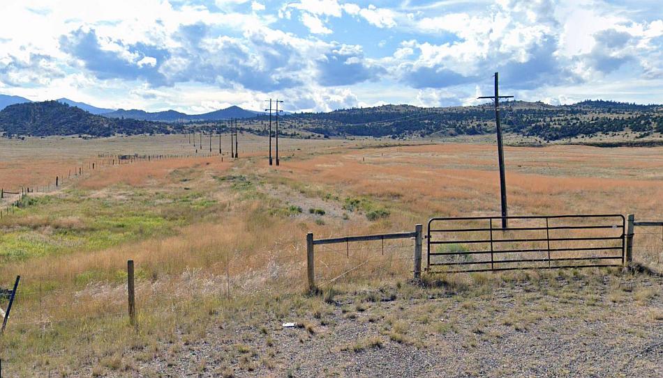 The course of the former Milwaukee Road as it curves across the countryside towards the Vendome loop and the Pipestone Pass. Much of the route is still characterised by electric distribution wires which remained long after the line closed, and are still used. Google Streets.