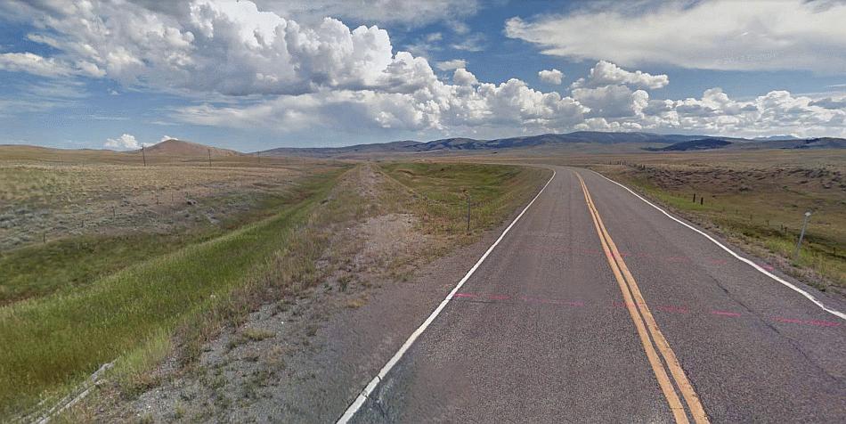 Top of the Pipestone Pass – number 3 on the map – looking north west. This is just over the Continental Divide. The railroad’s tunnel emerges from just below the road to the left and heads towards Blacktail Creek. Google Streets.