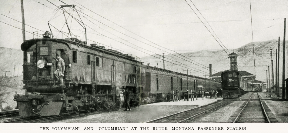 Butte station in 1920 with two of the Milwaukee’s express trains present.