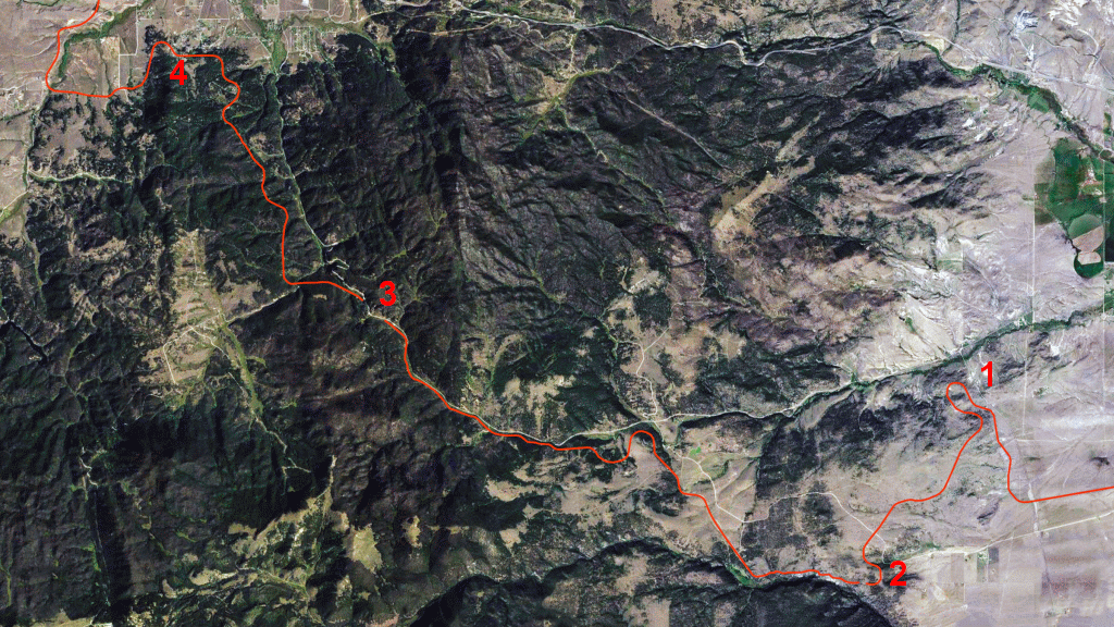 From Loweth the line goes over over the mountains to Ringling (very poor pictures here from Google) before following the Sixteen Mile Creek (a long, isolated stretch between 3 and 4 on the map which the Milwaukee company in part called it Montana Canyon) and the Missouri etc as far as Three Forks. There’s practically nowhere along this section that has any main roads (except for a glimpse at Trident) thus its not covered by Google, which means its Three Forks to the bottom of the Pipestone Pass that has a reasonable amount of coverage on Google Streets. There’s little to see in Three Forks however because the Milwaukee is now mostly roads.