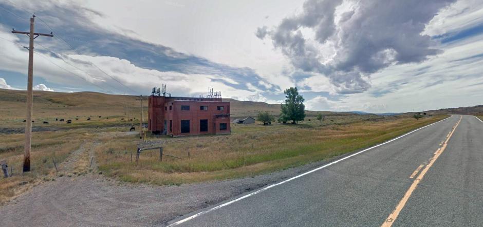 Sappington. The Milwaukee route was where the grassy patch (lighter shade) on the right side of the dirt track in the middle is. There was once a station here. The mills in the distance, along with another in Three Forks, produce most of the world’s talcum powder! Google Streets.
