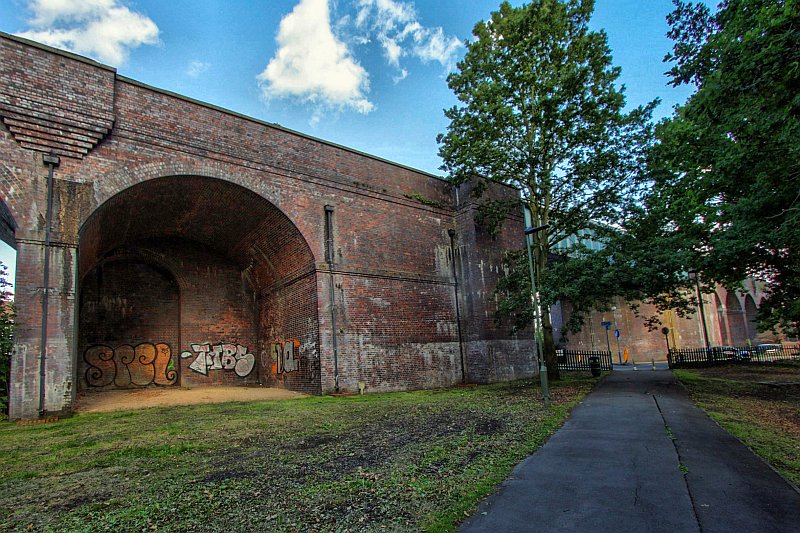 The northern end of the viaduct. Arches 33 and 34 (the blind arch) are within the park itself at far left. Following these is the Waterfall Road span. Hampden Way’s is just out of sight to the right.