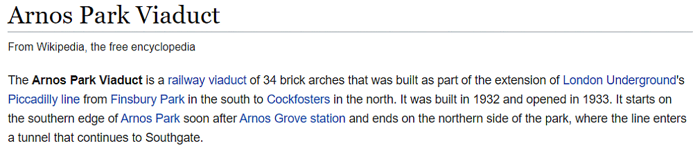 Arnos Park Viaduct on the Piccadilly Line is the biggest brick viaduct ever built for London’s underground under the LPTB. 3 million bricks were used in its construction and the viaduct was built in the early 1930s, with the railway upon it to Southgate, Oakwood and Cockfosters opening in 1933. The viaduct is also the last such example to be built for London’s tube system as well as being one of the last constructed in brick to be built in the UK.