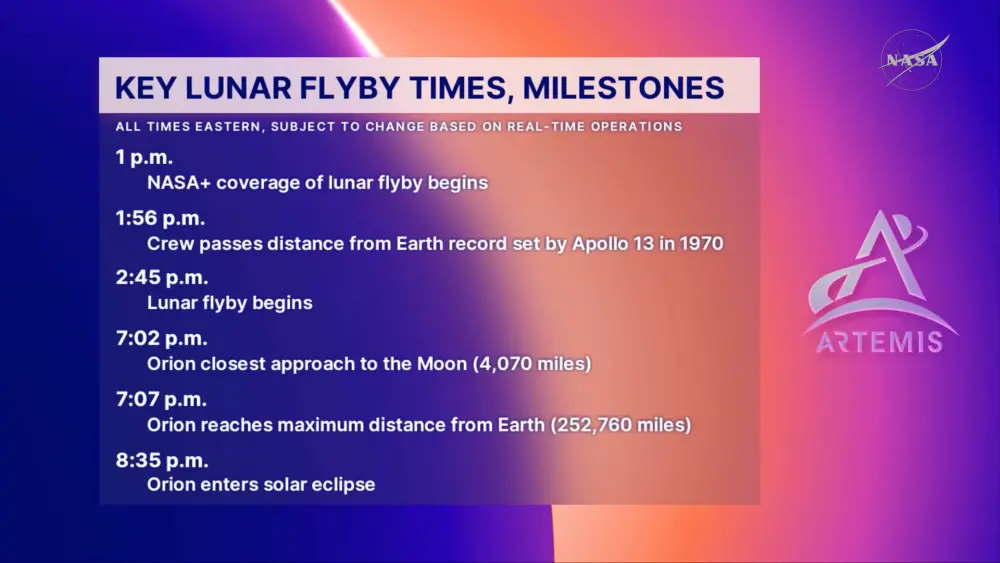 At 007.am UK time on 7th April Integrity reaches the furthest ever point from earth. 252,760 miles and about 4105 miles further than Apollo 13. Here are MCC’s timings below this was shown yesterday too.