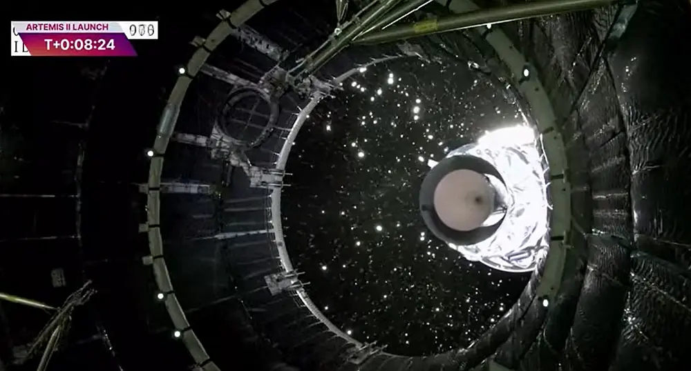 The camera has just been shifted to show the Orion capsule at around 14.10pm UK time. That after a few hours showing just part of the rear boosters.