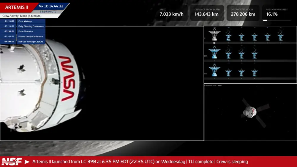 The cameras were rotated around quite a few times within this last two hours or so. MCC said this was activity that was undertaken to inspect the craft and ensure it had received no damage of any sort whilst taking off and also travelling. They say another similar inspection will take place on the return trip.