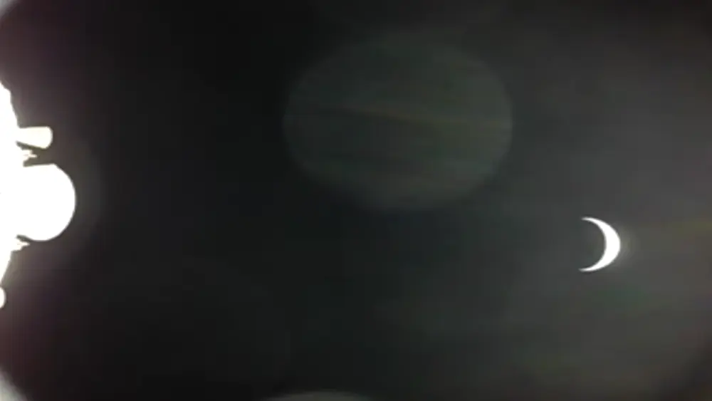The Earth backlit whilst eclipsing with the Sun. Two auroras can be seen one top and the other bottom left. Taken by Wiseman.