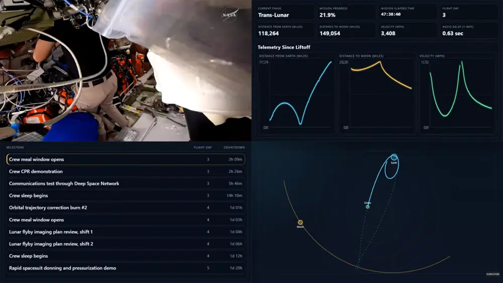The telemetry being seen during this period. Distance from Earth 118,264 miles. Distance to Moon 149,054 miles. Velocity has dropped well below 4,000mph.