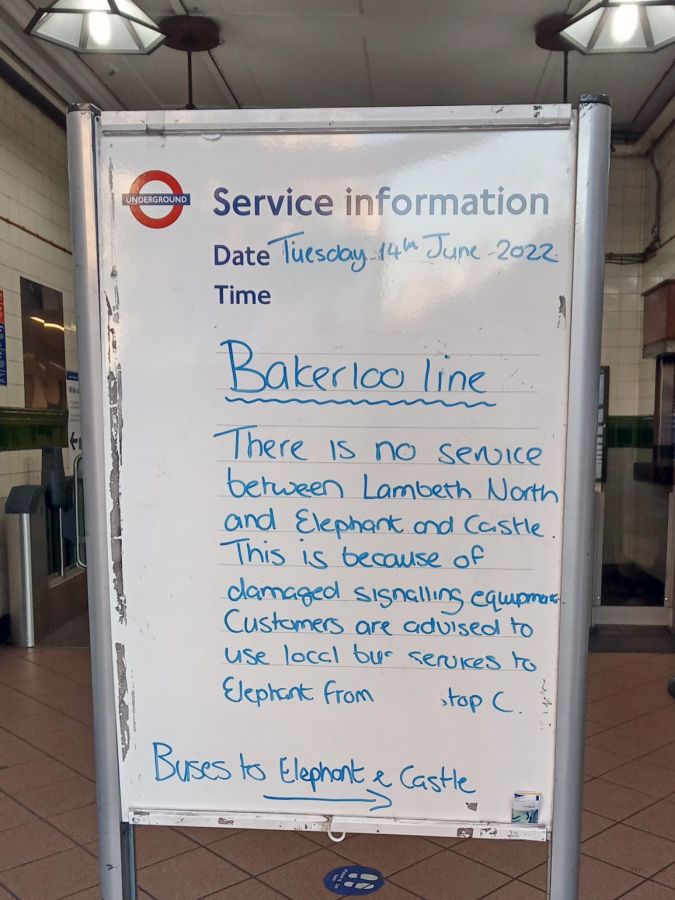 Notice at Lambeth North explaining the Bakerloo’s problems in brief. Yes one can get a bus but its good to walk too as its not far!