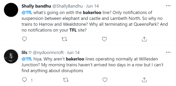 Tweets such as these (as well as the lack of Harrow services on platform indicators) indicated services north of Queen’s Park were largely suspended. It does seem TfL wasn’t saying anything on its social media about that except that there was a good service on the rest of the line…. Real train Times however shows Harrow trains were totally cancelled on 13th and 14th June (save for about eight or so services each day). Source: Twitter & Twitter.