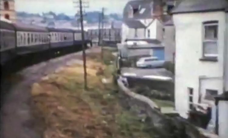 Note the clip shown below from this 1970 film of somewhat poor quality showing a train in the line’s final days passing the houses visible in the modern scene above! Also the terracotta brick warehouse seen on the left is just visible at left in the clip too.