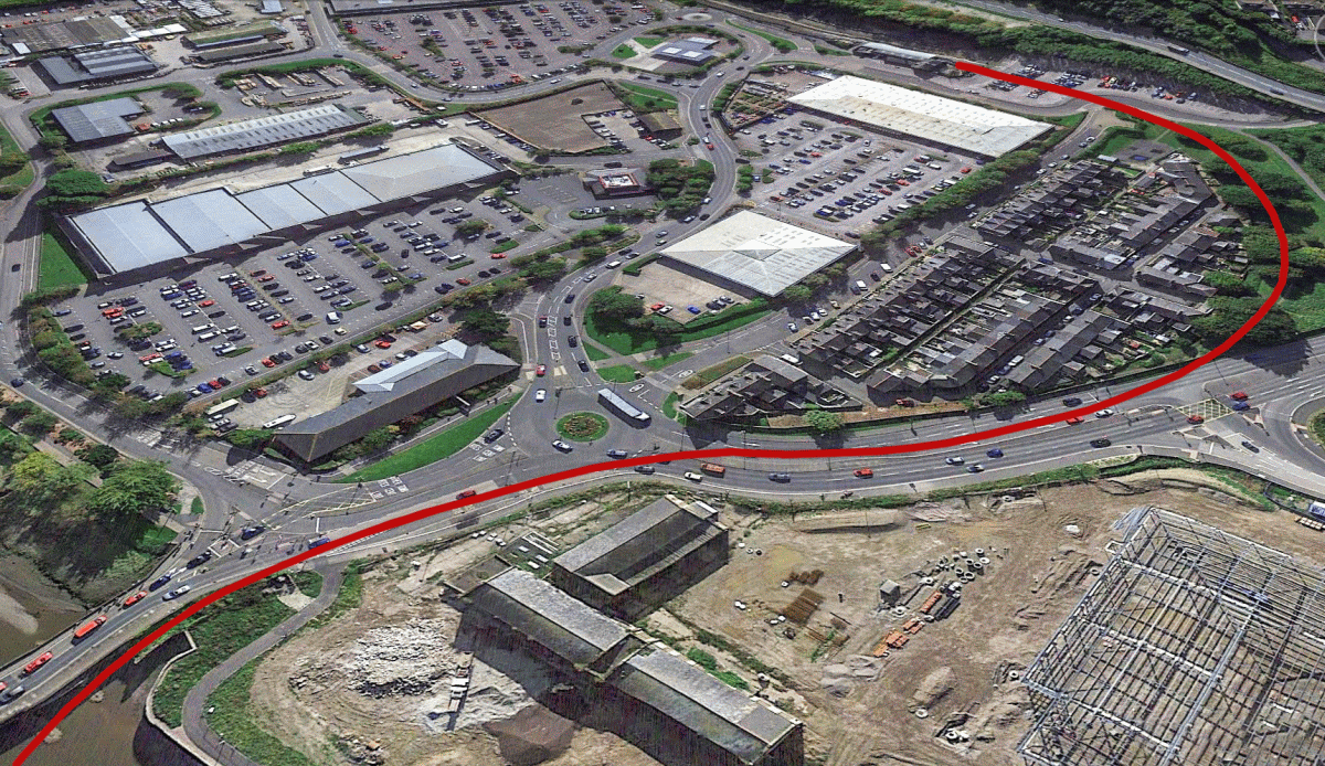 Aerial I created from Google Earth showing the railway’s exact alignment between Barnstaple Junction and the river. The perspective makes the route look a little squashed compared to how it looks as a near perfect ‘S’ on the Ordnance Survey maps. The purpose however is to show where the line stood in relation to the modern road layout.
