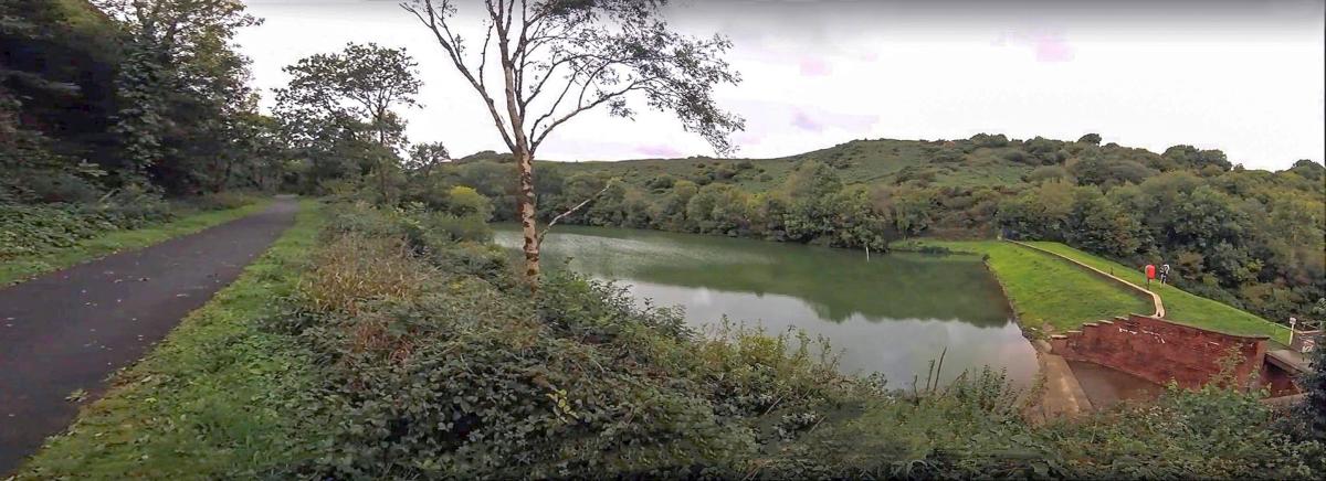 Vista of the reservoir and the former railway at the same location as the 1963 aerial. I created this specially from a You Tube video (link lost again on this one) by merging two different views from the video.