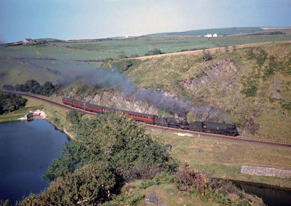 The up service to London passing the upper Slade reservoirs on 27 July 1963 in the care of both WR & SR engines, these are Mogul 6346 and 34079 141 Squadron respectively. Source: Twitter
