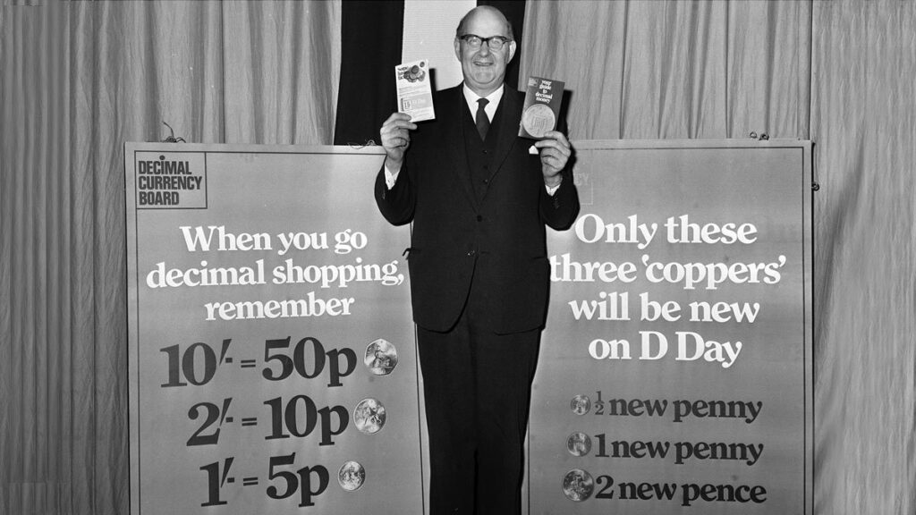 A reminder to use certain coppers only as DDay arrives! Lord Fiske, chair of the Decimal Currency Board does a presentation on the new currency. Source: Twitter.