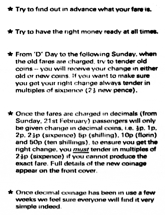 Between ‘D’ Day and 21st February fares will be charged in shillings and pence as hitherto, but from Sunday, 21st February, all bus fares will be charged in new pence and from that date only decimal coins will be given in change.