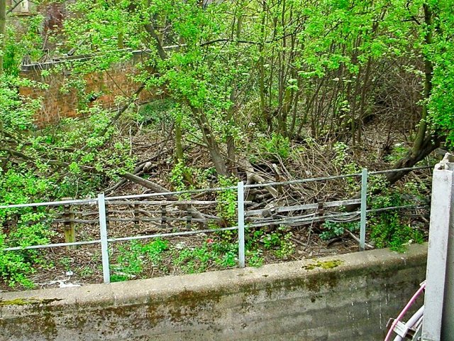 The different levels of track now in an overgrown state (2004) with the old Wood Lane station hidden in the foliage. The Hammersmith & City line bridge across Wood Lane can be seen in the distance.