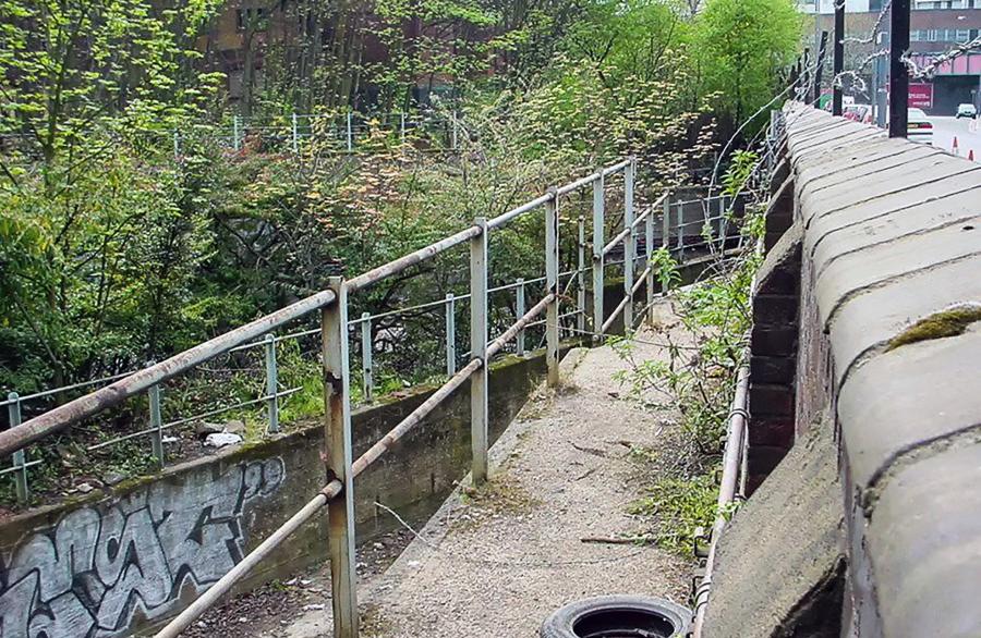 The patch of ground between the old Ariel Way bridge and Wood Lane viaduct today. See the old picture below for comparison.