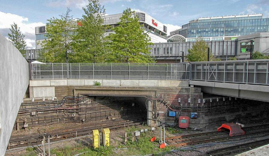 In this view showing the former power station buildings, the Central Line itself passes near the furthermost corner of the power station and then underneath One Ariel Way within the new Westfield Centre extension on the left. The location where I took my photograph from the old railway bridge is probably about 30 metres to the left and below the shopping centre itself.