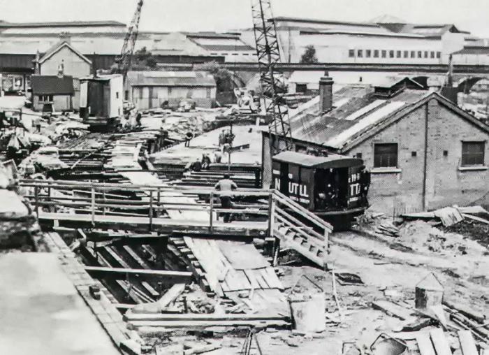 The construction of the Central Line’s new alignment in 1946. The old Wood Lane station sited on the viaduct had long been closed. The Hammersmith & City (Metropolitan Line) arches can be seen in the same position as the modern view. Both old and new photographs are taken from roughly the same spot. The old White City stadium is evident behind the viaduct.
