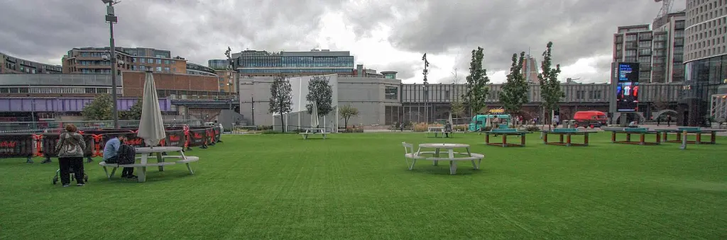 Up above ground the exact position from where I took these earlier pictures is no longer available. Its right under the Westfield Centre extension! One can however sense the trains running beneath this huge patch of artificial grass in front of the Westfield extension.