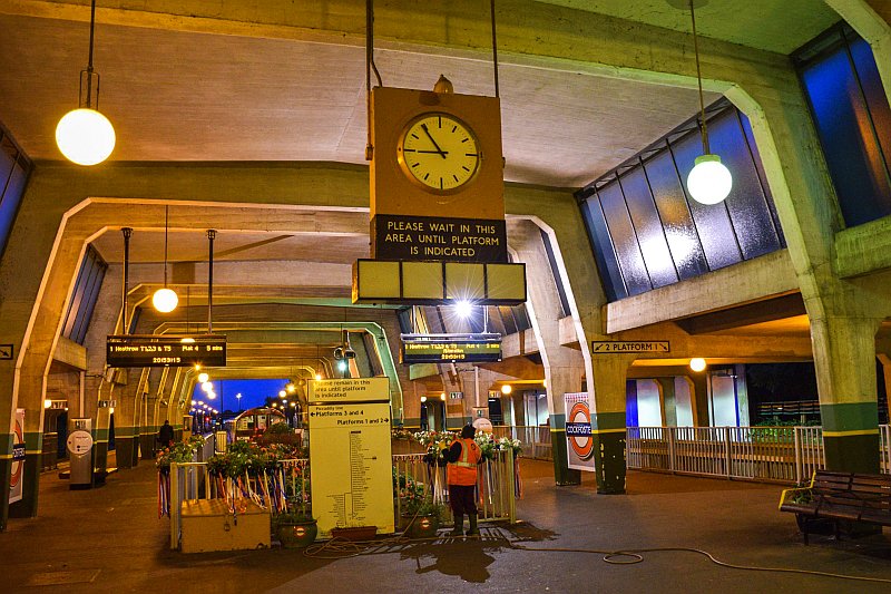 Night shot of the train shed at Cockfosters during summer 2017
