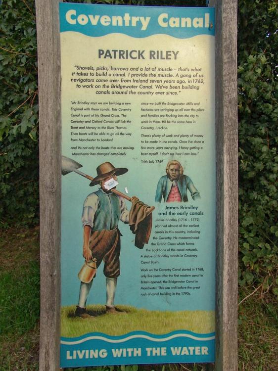 I dont know if Patrick Riley was a real navvy! But nevertheless here’s an interesting tale with a bit on Brindley added as an afterthought! This sign is almost opposite the Engine Pub at Longford.