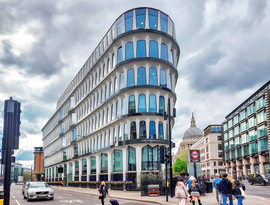 London’s’ very first GRC building is 30 Cannon Street – seen here with St Paul’s Cathedral as a backdrop. April 2025.