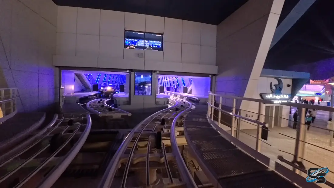 The very top of the ride’s second and very long lift hill goes over the brow of a vertical cliff. Its just about doable yet sometimes the Saudi heat can be too much for the ride because the wheels get too hot and too much friction is generated which causes the cars to resist to an extent the actual climb. This aspect of the ride is one certain issue that is going to affect just how much carrying capacity the ride has. Normally a ride of this type would have a quick turn around time however because of the enormous heat generated by the ride’s wheels as the cars race around the track, each train has to spend a minimum of four minutes at the starting station having their wheels cooled off. There is a special cooling system situated on both tracks in the starting station that perform this function. The picture below shows that.