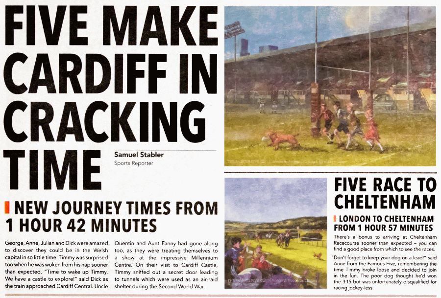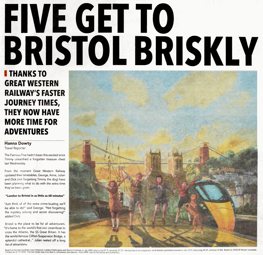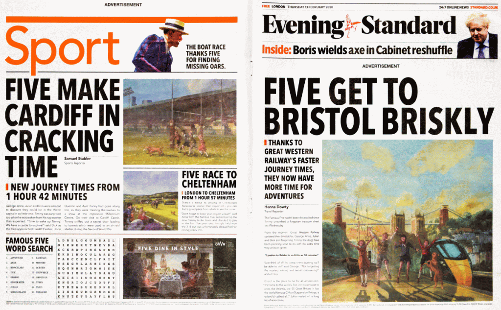 GWR has done lots of adverts revolving around the Famous Five, both day trips and holiday jaunts with many variations for each of the pictures that were produced with wide coverage in newspapers, on posters at many rail stations, and there are still lots of these GWR adverts to be seen in both social and news digital media.