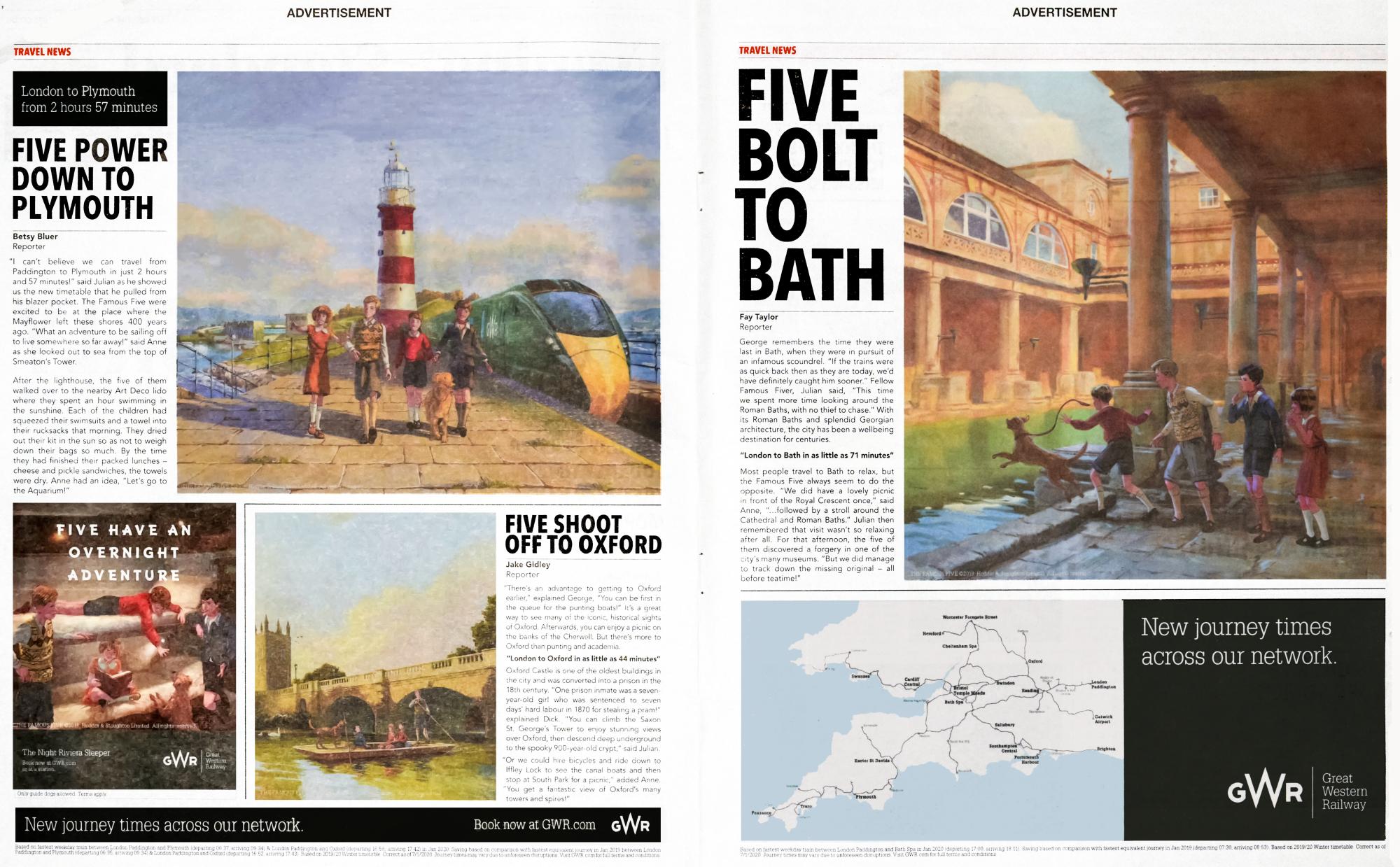 GWR has done lots of adverts revolving around the Famous Five, both day trips and holiday jaunts with many variations for each of the pictures that were produced with wide coverage in newspapers, on posters at many rail stations, and there are still lots of these GWR adverts to be seen in both social and news digital media.