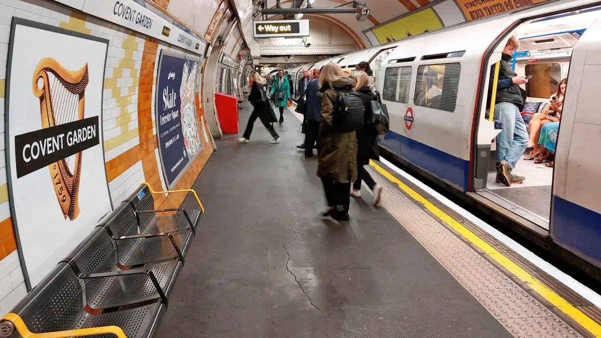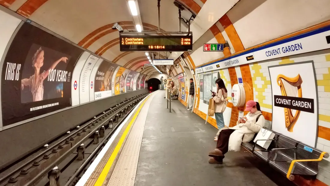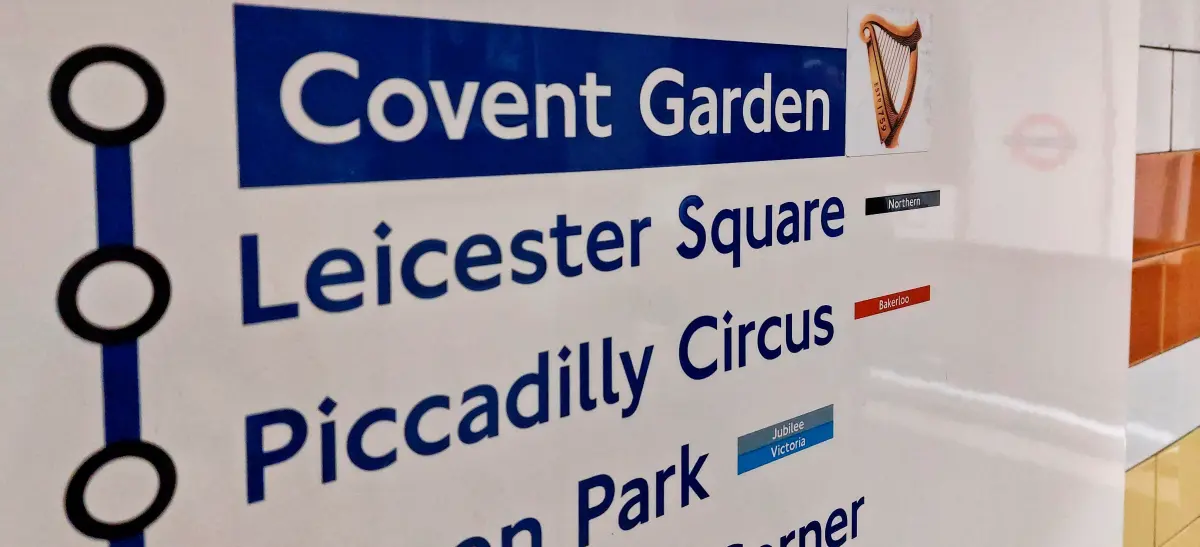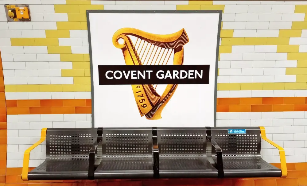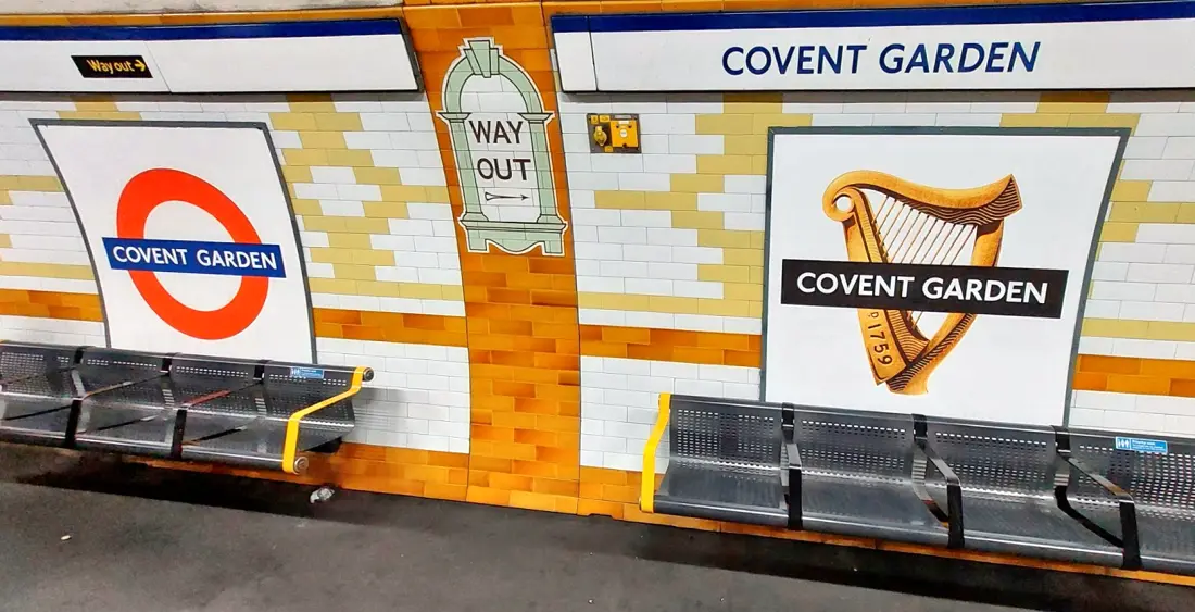 View of the eastbound platform at Covent Garden showing the Guinness roundel. The ‘bedrinkaware.co.uk’ label cannot be seen.