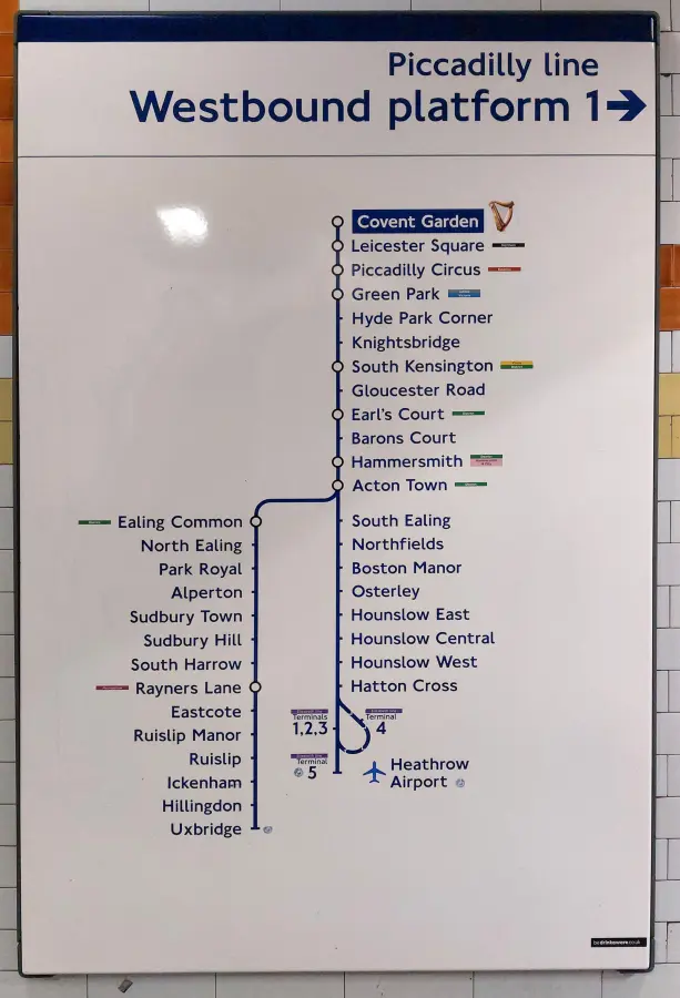 This close up view of the westbound Piccadilly tube map shows the pure simplicity exercised at Covent Garden station. Rather than do an entire map decal, TfL merely stuck labels on the enamel map to denote the Guinness harp and ‘bedrinkaware.co.uk’ label. Evidently its a reason why someone had a go at peeling the harp symbol off the eastbound map!