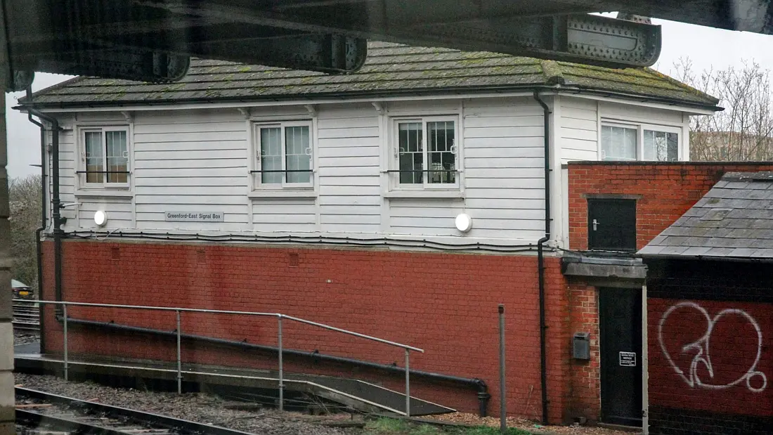 Greenford East signal box can be seen very briefly as the shuttle service enters the Greenford bay spur. London Rail/Author’s photo.