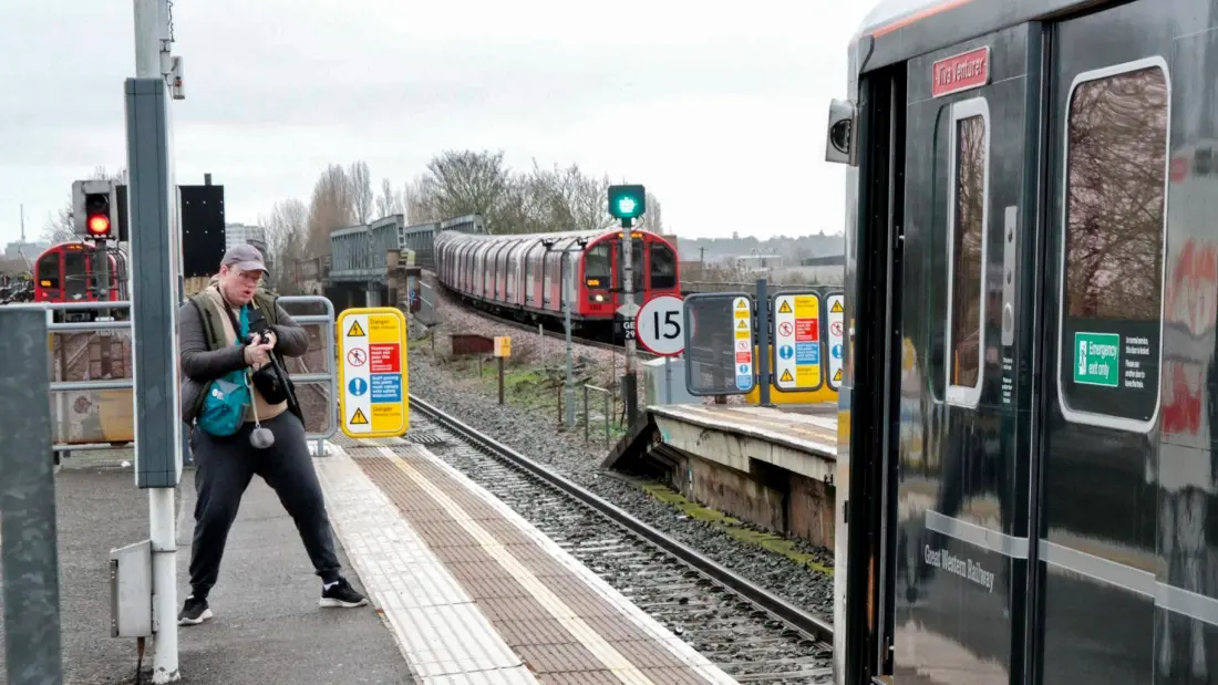 Enthusiast takes pics of the battery train on its first day of service as 1992 tube stock is seen both arriving and departing the station. London Rail/Author’s photo.