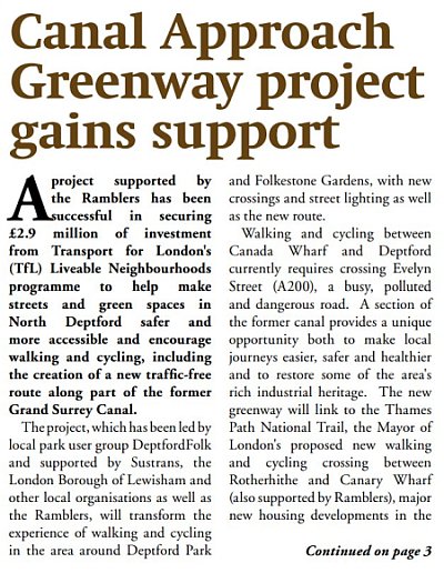 Two led walks were conducted in 2017 tracing the route of the Grand Surrey Canal, and these attracted large crowds. It demonstrated the level of local interest in rediscovering the old canal. The full report can be seen in the March 2018 South East Walkers Magazine. A full report (including a walking guide) to the canal can be seen in South East Walker magazines June 2017 and June 2018.
