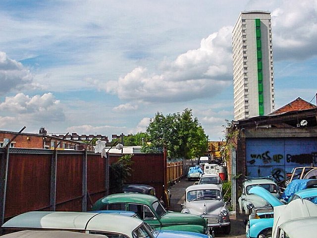 Repair yard for Morris Minors on the site of the old canal, seen in 2002, with Eddystone Tower prominent.