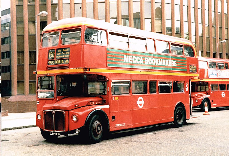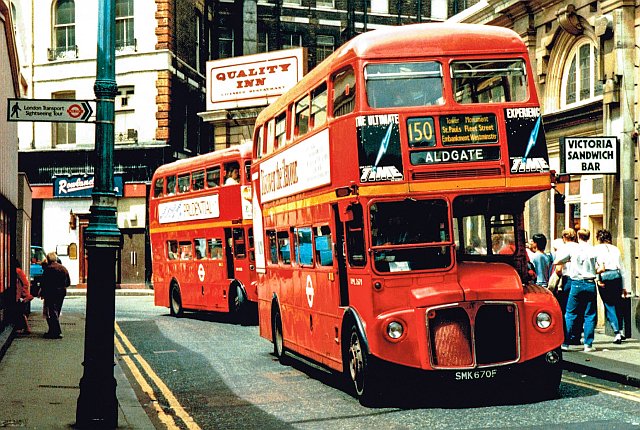RML 2402 at Aldgate. The bus behind, RML 886 is on stand-by for both the 15 and 150. 31/5/87.