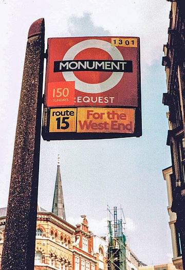 150 stops were indicated by an orange flash in lieu of the usual white employed for most London bus services and the orange ones were invariably found on white (compulsory) bus stops. The one at Monument was unusual being a request stop yet a compulsory stop for the 150!