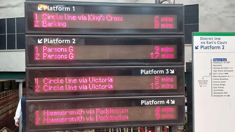 Everyone gets it wrong (even the best vloggers and bloggers) about these indicators at Edgware Road (District/Circle). They were established in the late 1980s because so many deafblind people were getting confused at this station as to which trains they ought to take (or change to). The red actually stands out better against bright backgrounds (in this case that was the sky) thus a blind or a deafblind person would have to be close to the signs (especially those on the platforms) and almost directly look up with the sky constituting an enormous background. LU considered other stations where similar conditions might prevail, however numerous complaints ensured no further examples were installed apart from those at this station. This was almost certainly a case of a ‘power’ of ability winning over disability.