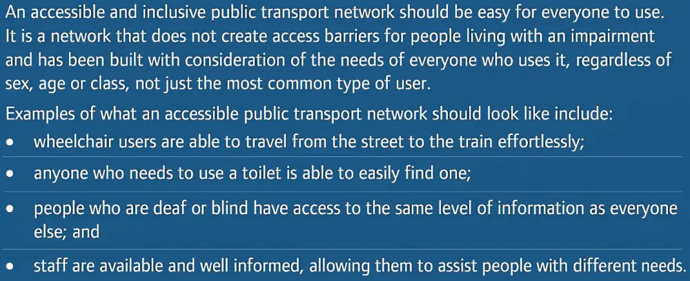 “An accessible and inclusive public transport network should be easy for everyone to use. It is a network that does not create access barriers for people living with an impairment…”